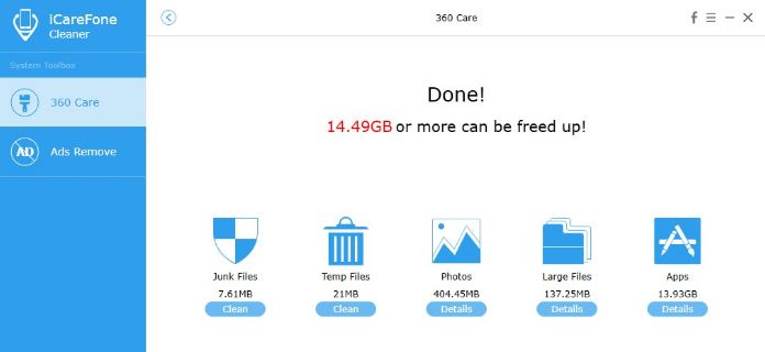 With ICareFone Cleaner, you can now enjoy a whole new experience on your iPhone. The free tool is designed exclusively for iPhone cleaning, while still protecting your privacy and securing your information. It will boost up your phone’s speed and create larger storage space.